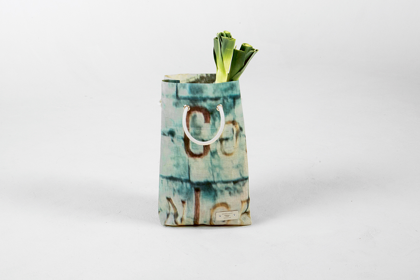 "Handymade in Brussels" is a unique collection of handmade bags; a pattern designed on the tarp that hung from the scaffolding during the renovation of buildings in the Grand-Place. This project was produced in collaboration with l’Ouvroir (an adapted work enterprise), MAD- Brussels Fashion and Design Platform, and the ASPH. The aim was to repurpose what would otherwise be considered as waste material. Each bag has been tagged with a metal plate numbered from 1 to 480, making it possible to pinpoint the exact location of the piece of tarp your bag is made from.